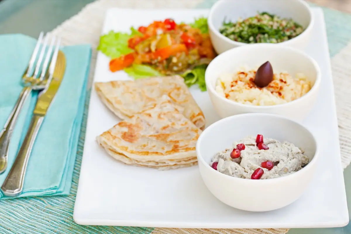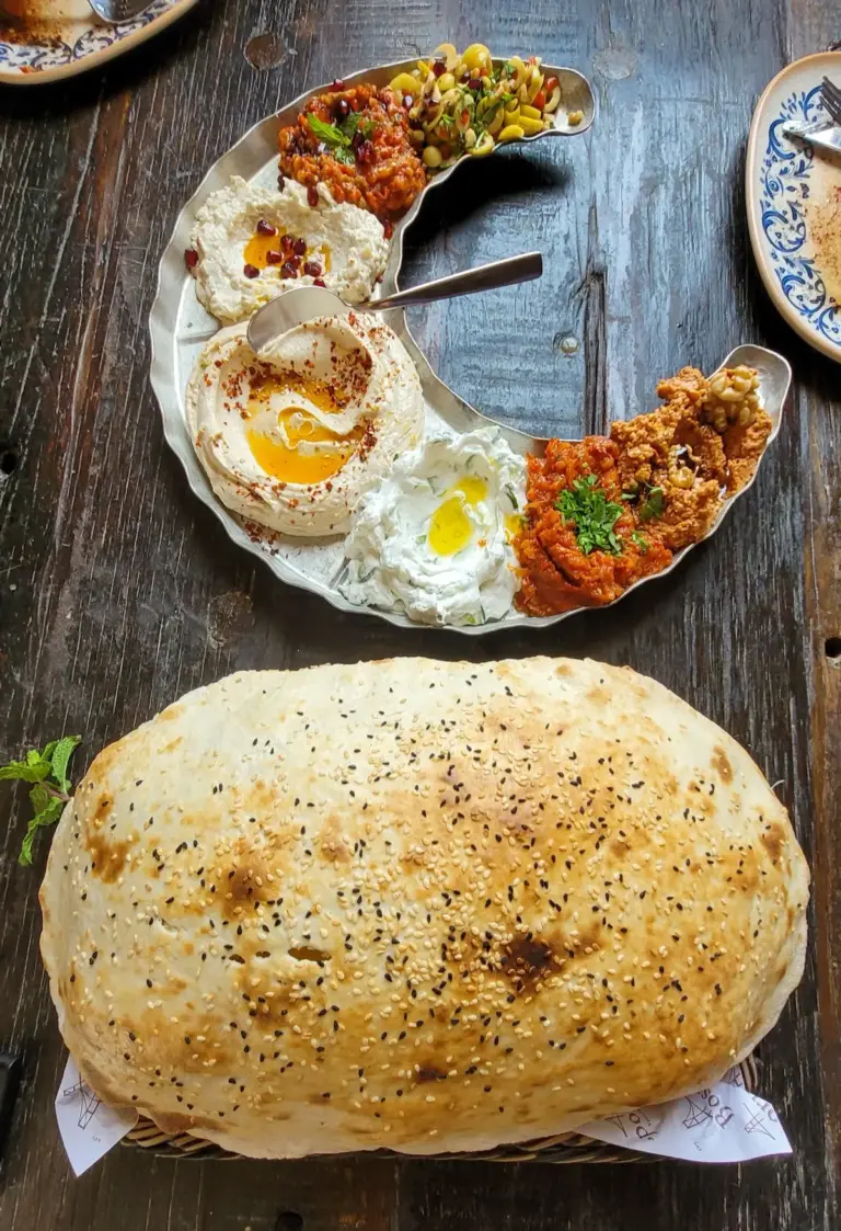 Frisch gebackenes Fladenbrot, hausgemachte Aufstriche wie Sesampaste oder Dattelcreme, fruchtige Marmeladen, knackiges Gemüse, würziges Rührtofu mit Kräutern, Oliven, Nüsse und frisches Obst.